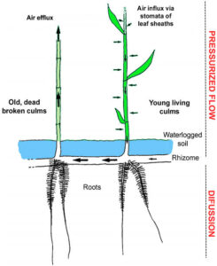 In wetlands, roots need oxygen, but sometimes the soil is waterlogged and has very little oxygen. Some wetland plants have specialised root systems that allow them to take in oxygen from the air, like the snorkel roots of the mangrove or the pneumatophores of the black mangrove. These roots grow upward out of the soil to get oxygen directly from the air.