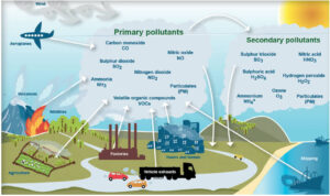Polluted air damages crops, forests, and aquatic ecosystems. Acid rain, caused by sulphur and nitrogen emissions, can destroy plant life and reduce soil fertility.