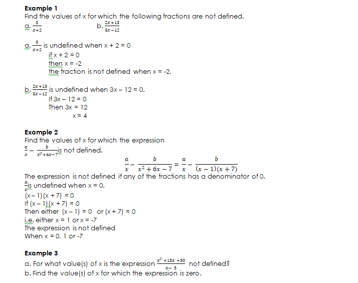 If the denominator of a fraction has the value zero, the fraction will be undefined. If an expression contains an undefined fraction, the whole expression is undefined.