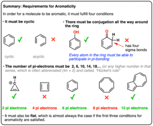 Follows Hückel’s Rule – The molecule must have (4n + 2) π electrons, where n is a whole number (0, 1, 2, 3…).