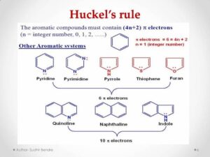 - Hückel’s Rule: (4n + 2) π electrons → aromatic stability.