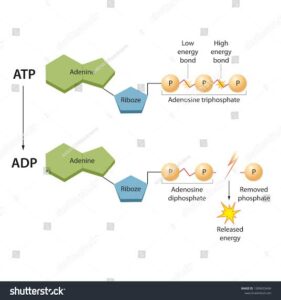 The energy in ATP is stored in the bonds between the phosphate groups, especially the last phosphate bond. When the cell breaks that bond, energy is released, and ATP becomes ADP (Adenosine Diphosphate). It’s like spending money—when you remove ₦1,000 from your wallet (ATP), you’re left with less cash (ADP).