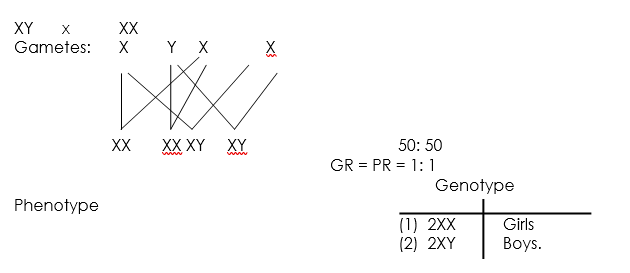 Each body cell of human beings has 23 pairs (46) of chromosomes, 22 of which are autosomes and a pair is sex chromosome. In male the two sex chromosomes in each body cell are X and Y chromosomes, therefore, each male gamete carries either X or Y chromosome. In the female, all egg cells of the body contain two X chromosomes. Therefore all egg cells contain one X chromosomes each. At fertilization, the combinations of an egg with a sperm carrying either X or Y chromosome occurs by chance. The formation of a male or female offspring has equal chances as shown below parents: