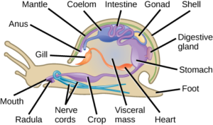 Molluscs have a soft body that is usually divided into three major parts: the head-foot, visceral mass, and mantle.