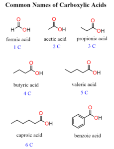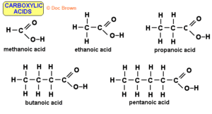 Example: Methanoic acid (HCOOH), Ethanoic acid (CH₃COOH)