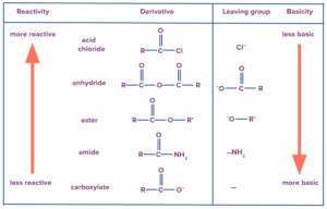 - Reactivity order: Acid chlorides > Acid anhydrides > Esters > Amides.
