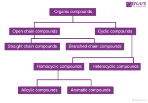 Acyclic (Open-chain) Compounds: These have straight or branched chains. Example: butane (used in cooking gas).