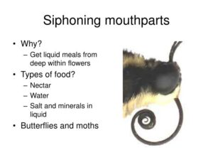 - Characteristics: Insects with siphoning mouthparts have a long, coiled proboscis that they use to suck up liquids. The proboscis is often long and slender, allowing the insect to reach deep into flowers or other sources of nectar.