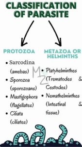 - Parasites can be classified into protozoa and helminths.