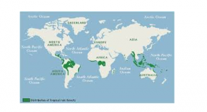 It is found between lat 200 and 400N and S of the equator in places like South East Australia, Central part of South America, Central China, south Japan, New Zealand and South East US.