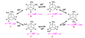 In butane (C₄H₁₀), rotation around the central C–C bond gives rise to several key conformations: the anti conformation, where the two methyl groups are 180° apart (most stable); the gauche conformation, where methyl groups are 60° apart (slightly less stable due to steric hindrance); and the eclipsed conformations, where groups are directly aligned (least stable).