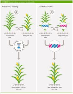 - Conventional breeding uses natural methods like selection and crossing; it’s time-consuming but still effective.