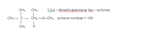 A straight-chain alkane like heptanes is assigned an octane number of O while a highly branched-chain alkane like 2,2,4 trimethylpentane is assigned an octane number of 100 which burns very smoothly in engines. Therefore the quality of any petrol is rated according to its octane number, i.e. the percentage of heptanes to 2,2,4 – trimethylpentane in a mixture.