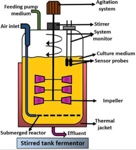 This is the most commonly used type of fermenter. It looks like a big cylindrical tank with motorised stirrers (impellers) and spargers to introduce air.