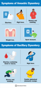 - Dysentery involves blood or mucus in stool and usually results from bacterial or parasitic infections.