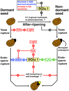 Example: Some desert plant seeds go fit stay inside soil for years until one serious rain fall — ABA go reduce, and gibberellins go rise, causing germination.