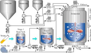 Process: Carbohydrates like glucose or molasses are fermented in a submerged fermentation system.