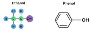 Phenols also have the –OH group, but the difference is that it’s attached to a benzene ring instead of a normal alkyl chain. That’s what makes them special.