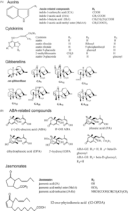 Functions and interactions of auxins, gibberellins, cytokinins, ethylene, and abscisic acid