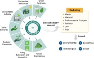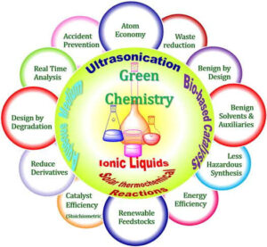 - Its key principles include atom economy, waste prevention, use of renewable resources, and safer solvents.