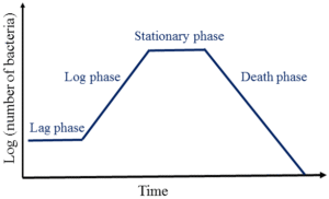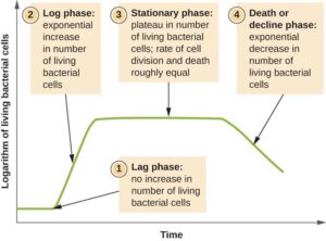 Next comes the log phase, also called the exponential phase. This is when bacteria start dividing very quickly. They reproduce at their fastest rate, doubling in number over and over.
