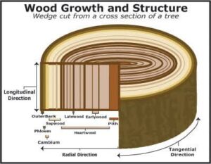 Earlywood (Springwood) – Light-coloured, wider, and forms during the rainy or growing season when water is abundant, and cells grow rapidly.