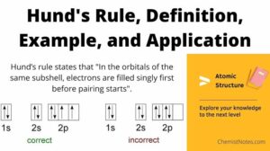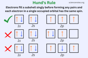 Hund’s Rule states that when electrons occupy orbitals of the same energy (called degenerate orbitals), they fill them singly first with parallel spins before pairing up.