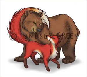 But then the first winter came and with it came the first trouble. Snow covered everything. There was a frost on the berries and ice covered the lake and Fox and Bear couldn’t find anything to eat. Soon they were very hungry and very cross and they began to argue. The animals became jealous of Bear’s tail and Fox was the most jealous.