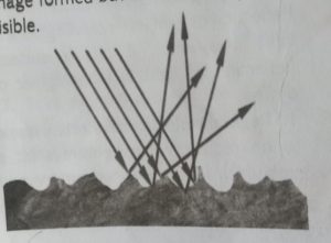 2. Diffuse reflection: Reflection is said to be diffuse or irregular when light rays hit a rough surface. The reflected rays will be scattered in different directions. Diffuse reflection takes place when light rays are incident on a surface like a wall, a piece of wool, a leaf of a tree, etc. In diffuse reflection, there is no definite Image formed but the surface becomes visible.