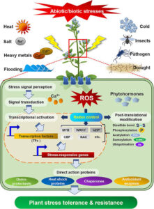 When plants face stress, dem produce bad molecules called reactive oxygen species (ROS). These ROS na like yawa — dem fit damage DNA, membranes and enzymes.