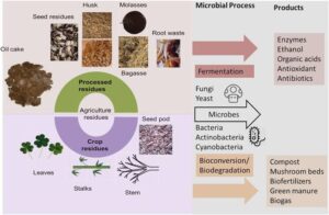 Decomposition: Microbes such as Bacillus, Aspergillus, and Actinobacteria break down complex waste materials into simpler organic matter.