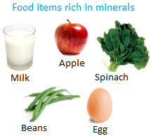 Examples of minerals include: calcium, Phosphorus, Magnesium, Sulphur, Iron, Iodine etc.