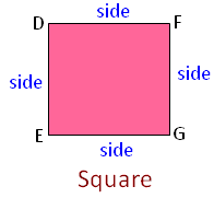 - It is also like a rectangle having all four sides equal. Like rectangle, the line-segments of the square are also known as sides. In the above square DEFG, there are four sides DE, EF, FG and GD; these sides are equal and they are four vertices D, E, F and G.