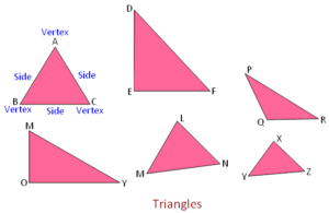 There are triangles having three sides of different lengths. Every triangle has three vertices. In the above, triangle ABC, DEF and PQR are of different shapes.