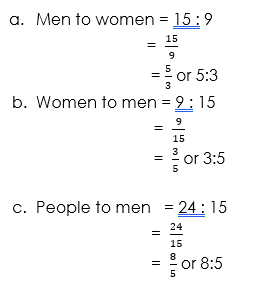 - In a bus, there are 9 women and 15 men. Find the ratio to the simplest form of the number of: