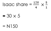 - Emmanuel and Isaac shared some money in the ratio of 4: 5 respectively. If Emmanuel got N120, how much did Isaac get?