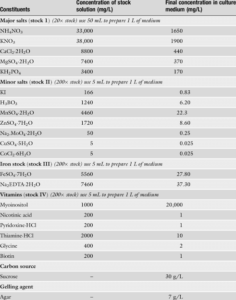 Nutritional media (e.g., Murashige and Skoog medium) and growth regulators