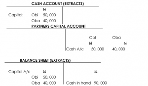 Obi and Oba are partners in a firm of chartered accountants with initial capital contributions of N50,000 and N40,000 respectively which are to be kept fixed in the partnership books. You are required to show the cash account, partners’ capital accounts and balance sheet extracts.
