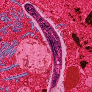 Malaria is transmitted to people and animals by mosquitoes. Malarial sporozoites develop inside oocysts and are released in large numbers into the hemocoel of Anopheles stephensi mosquitoes. This false-colored electron micrograph shows a sporozoite migrating through the cytoplasm of midgut epithelia. See Frevert et al.