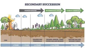 - Secondary Succession starts after disturbance (soil still dey), faster recovery.
