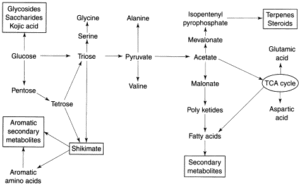 - Citric acid is a primary metabolite produced by Aspergillus niger when grown on sugar-rich media under specific conditions.