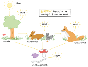 Energy flows through these trophic levels in a one-way direction: from producers to herbivores to carnivores and finally to decomposers. However, only about 10% of the energy from one trophic level is passed on to the next level. The rest is used by the organisms for their own survival (e.g., for movement, growth, and reproduction). This is known as the 10% rule.