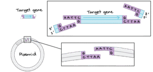 The cut piece is inserted into another DNA molecule (like a plasmid).