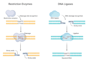 Let’s imagine your DNA is like a long beaded necklace — made up of many different coloured beads arranged in a special pattern. Now imagine you want to cut a part of that necklace and join it with a piece from another necklace. How would you do that neatly? That’s exactly what restriction enzymes and ligases help scientists do with DNA.