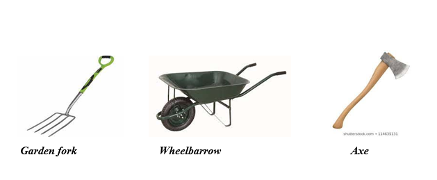 Spade, Hoe, Shovel, Matchet, Pickaxe, Rake, Wheelbarrow, Hand towel, Garden fork. Axe, etc.