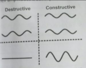 - Destructive interference: This occurs when two travelling waves in the same medium interfere with each other and their amplitudes are out of phase.