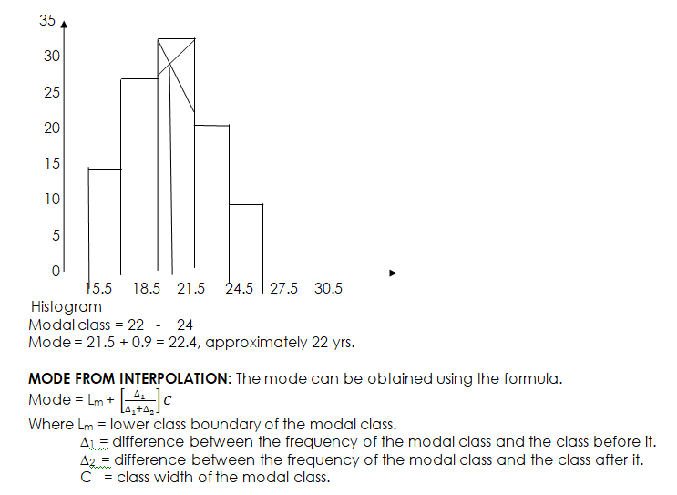 Modal class = 22 – 24, ∆1 = 35 – 30 = 5, ∆2 = 35 – 24 = 11, C = 3, Lm = 21.5