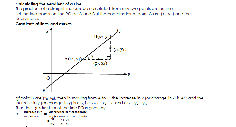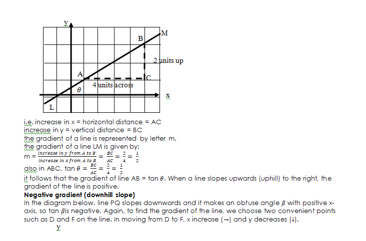 Consider line LM shown in the diagram below. The line slopes upwards to the right and it makes an acute angle of with the positive x-axis, so tan is positive. The gradient of the line can be found by choosing any two convenient points such as A and B on the line. In moving from A to B, x increases ( ) and y also increases ( ).
