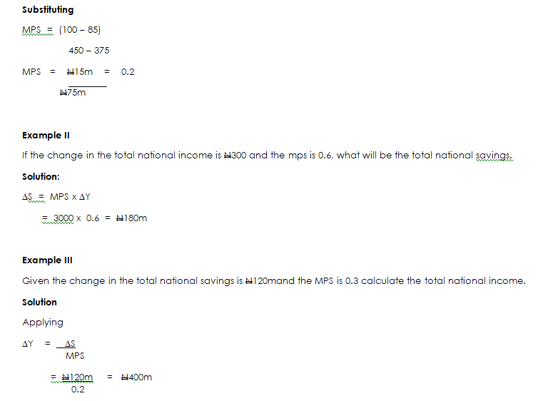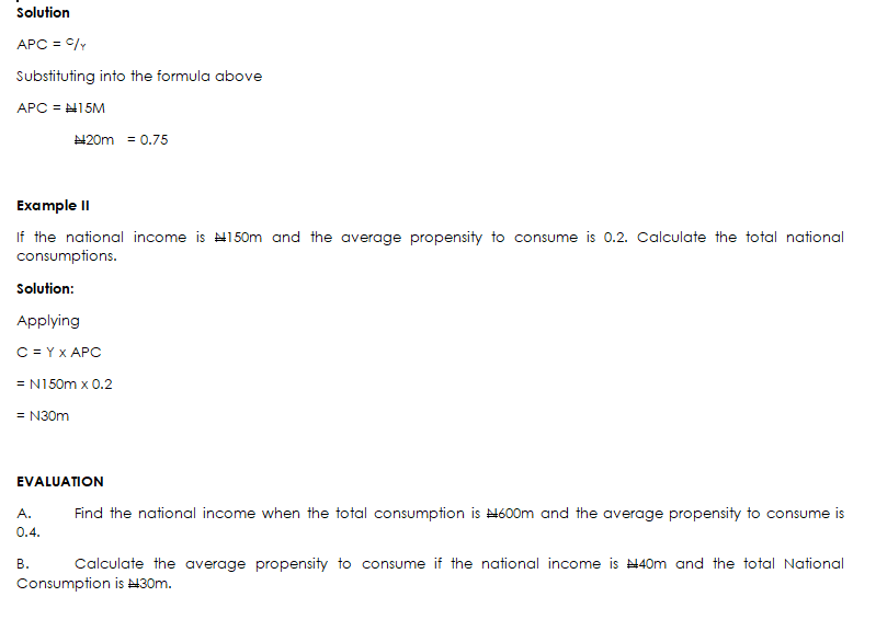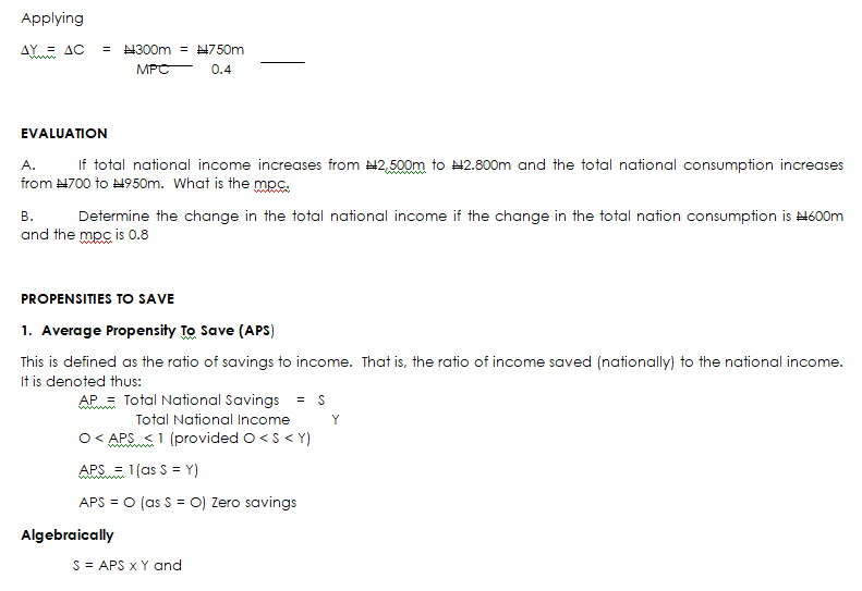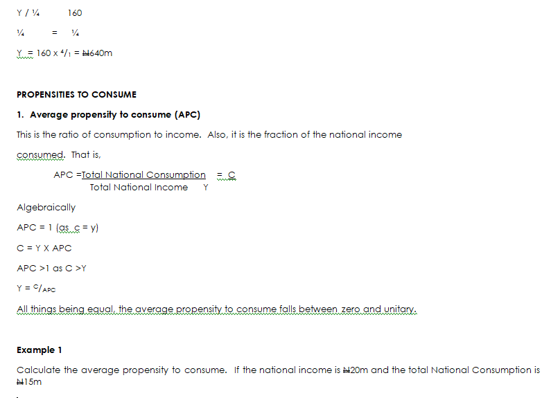 - Find the national income when the total consumption is N600m and the average propensity to consume is 0.4.