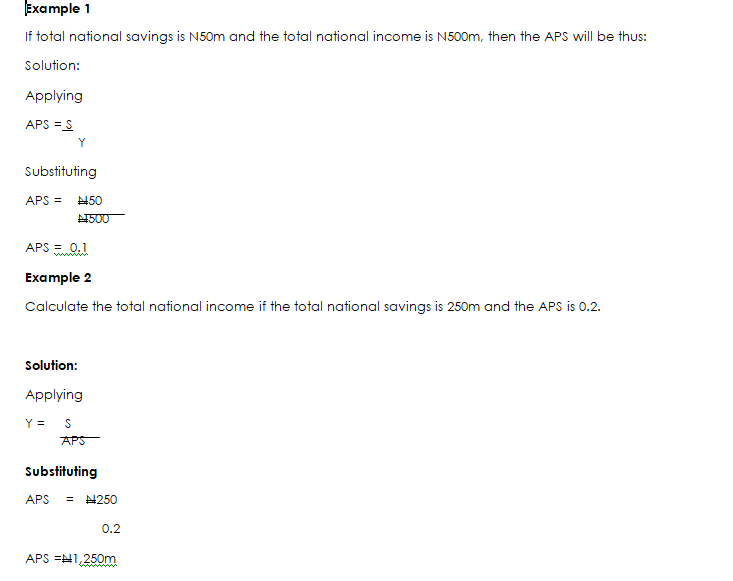 If total national savings is N50m and the total national income is N500m, then the APS will be thus: